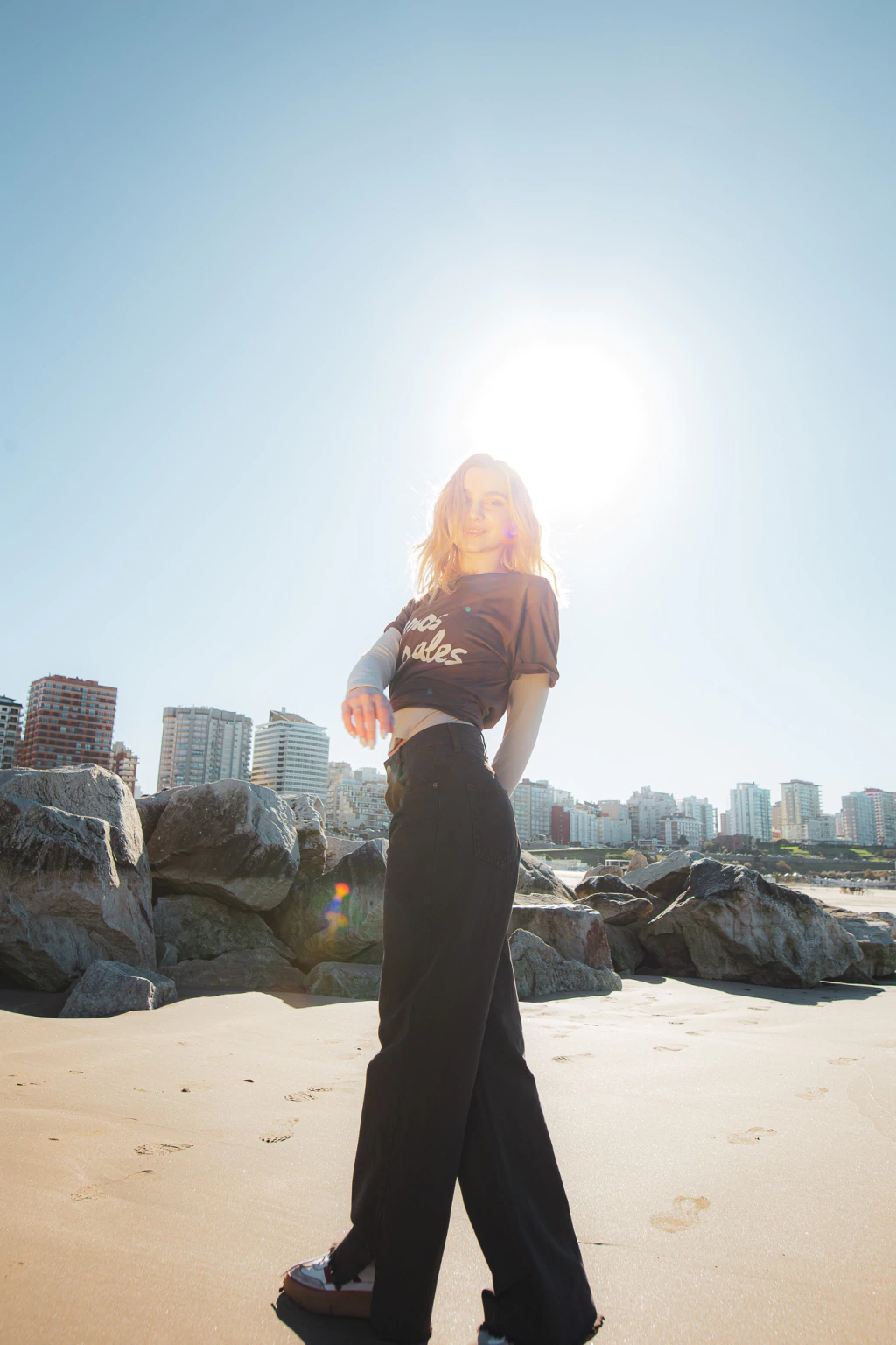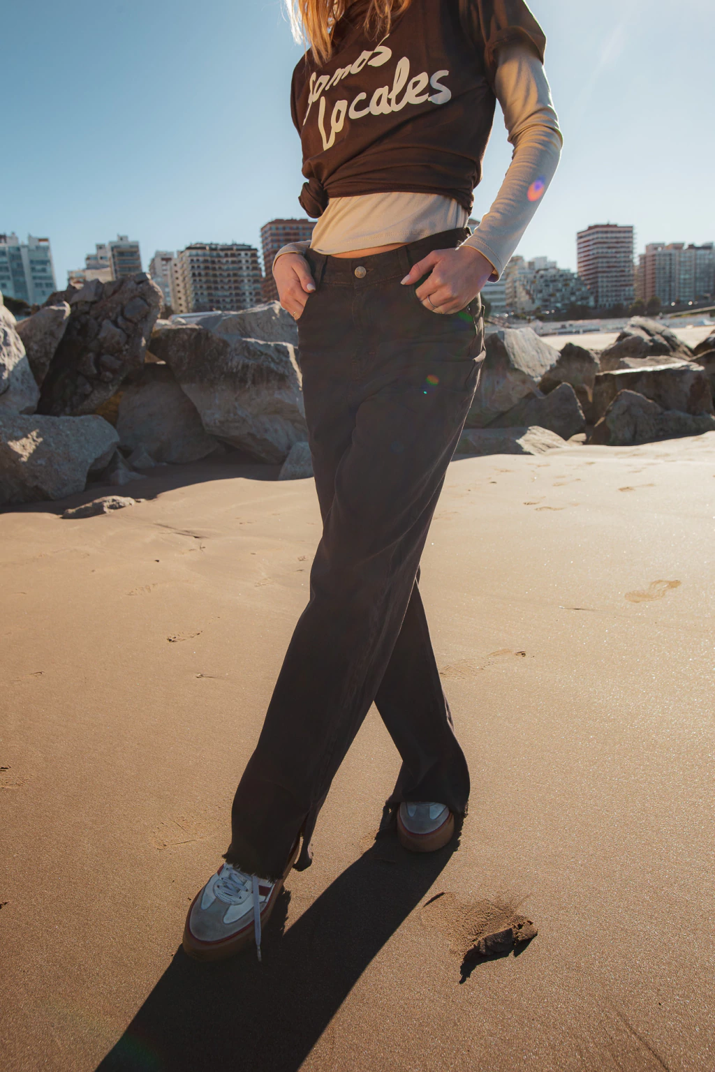 Silueta recta, calce relajado desde la cadera con detalle de tajo en terminaciones.
